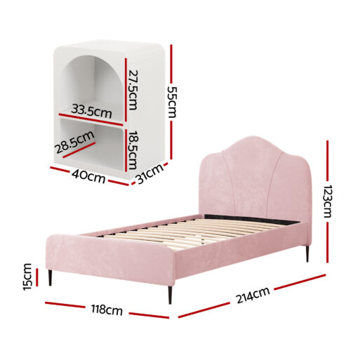 Key Details: The bed frame measures 214cm x 118cm x 123cm, holds a standard King Single mattress (107cm x 203cm), and includes a bedside table measuring 40cm x 31cm x 55cm. Both items require assembly and are made from premium materials for lasting quality. This product is suitable for children and teens.